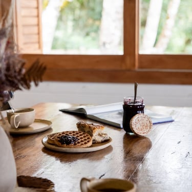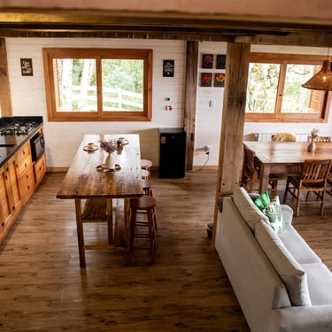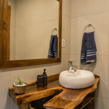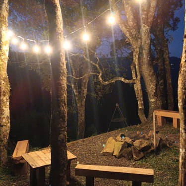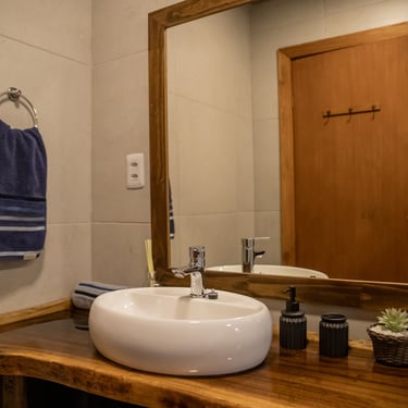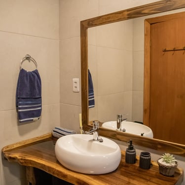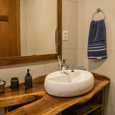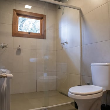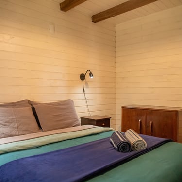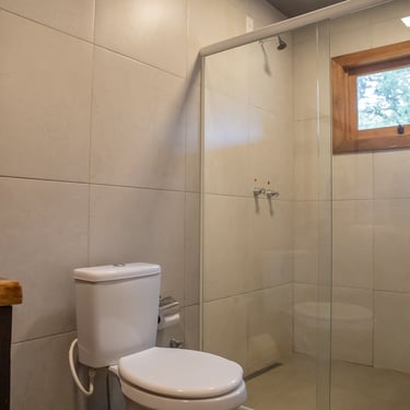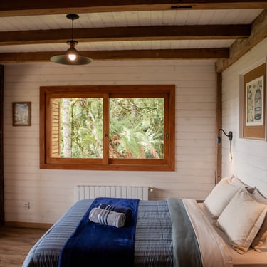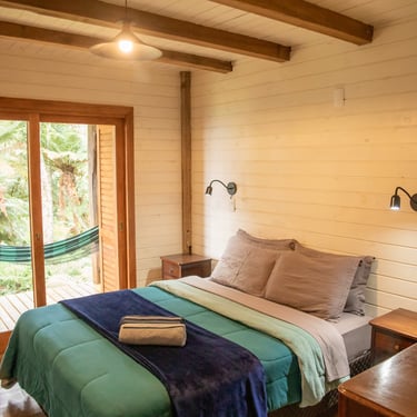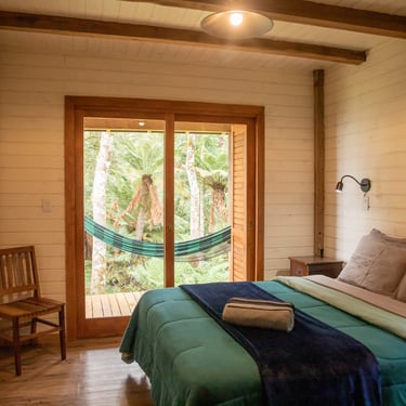 Ambiente acolhedor e espaçoso com cama Queen e vista para o bosque.