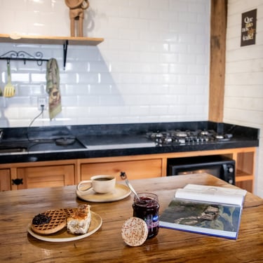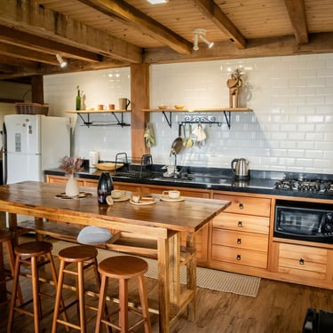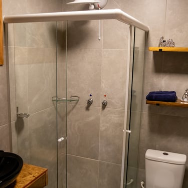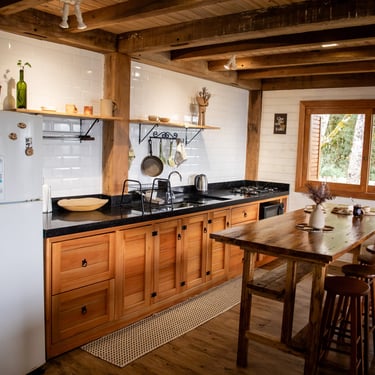 Equipada com geladeira grande, fogão cooktop 5 bocas, forno elétrico e chaleira elétrica.