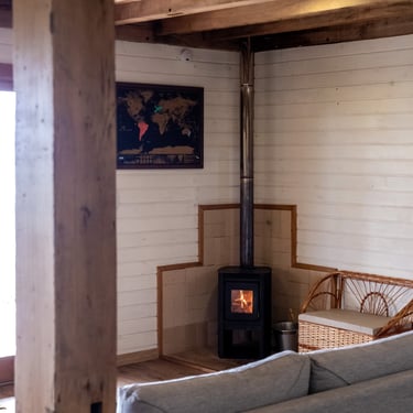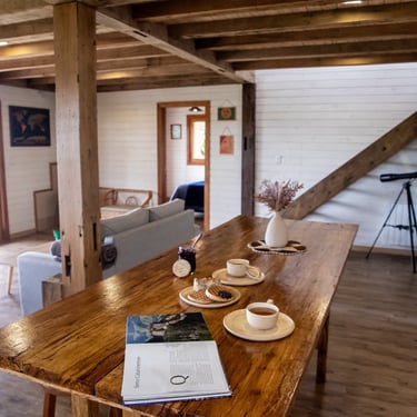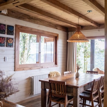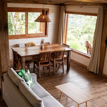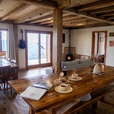 Lareira duplas combustão, mesa de 6 lugares, sofá e a vista incrível das montanhas.